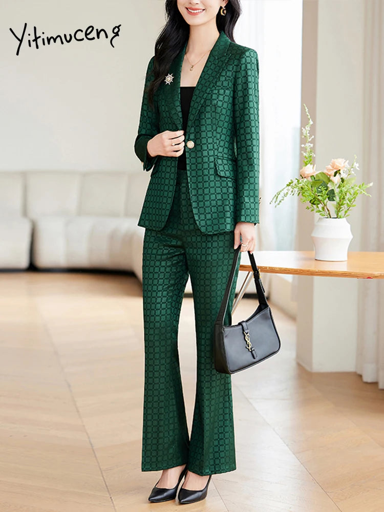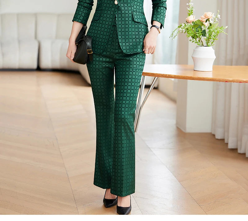 Grønternet jakkesæt til kvinder, elegant design med bukser og jakke, sort taske, sorte sko, moderne indretning, stilfuldt kontorlook.