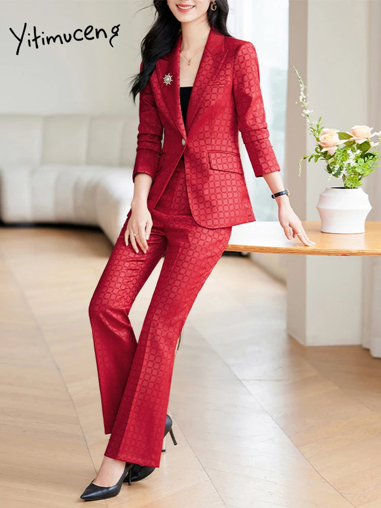 Rød jakkesæt til kvinder med ternet mønster, lange bukser og matchende jakke. Elegant kontorlook, perfekt til forretningsmøder.