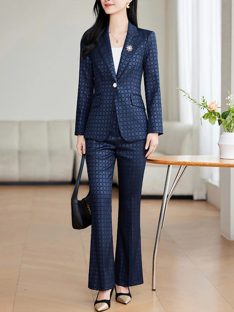 Kvinde i elegant, mørkeblå jakkesæt med mønster, står i moderne stue. Hun bærer sort taske og hvide sko. Perfekt til business og formelle lejligheder.