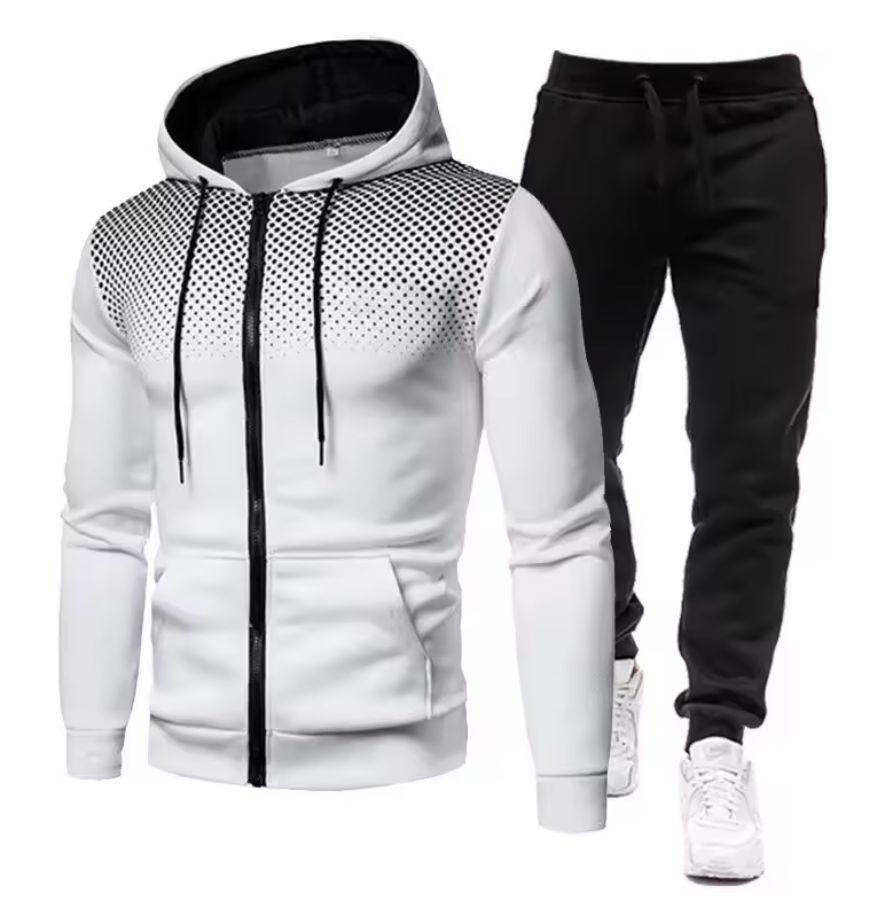 Hvid hættetrøje med sort mønster og sorte joggingbukser. Sportstøj til mænd, komfortabelt og stilfuldt til træning eller afslapning.