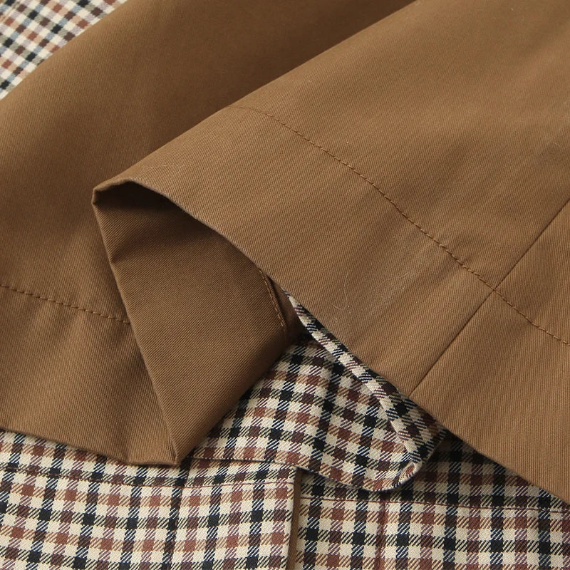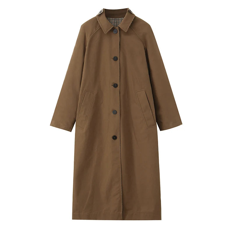 Ta długa kurtka damska jest dwustronna (Double Sided Plaid), co daje dwie możliwości stylizacji: jedna strona jest w kratę, a druga często jednokolorowa (lub z innym wzorem). Kurtka ma zapinanie na jeden guzik (Single Breasted) i długie rękawy. Długa sylwetka i wzór w kratę tworzą klasyczną i stylową odzież wierzchnią na jesień.