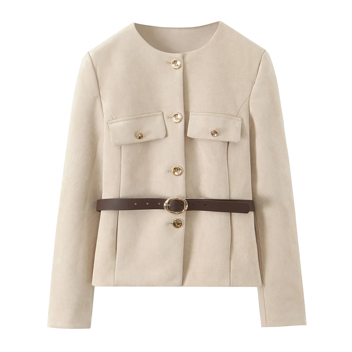 Beige jakke med rund hals, guldknapper og to brystlommer. Designet inkluderer et brunt bælte. Elegant og stilfuldt tøj til kvinder.