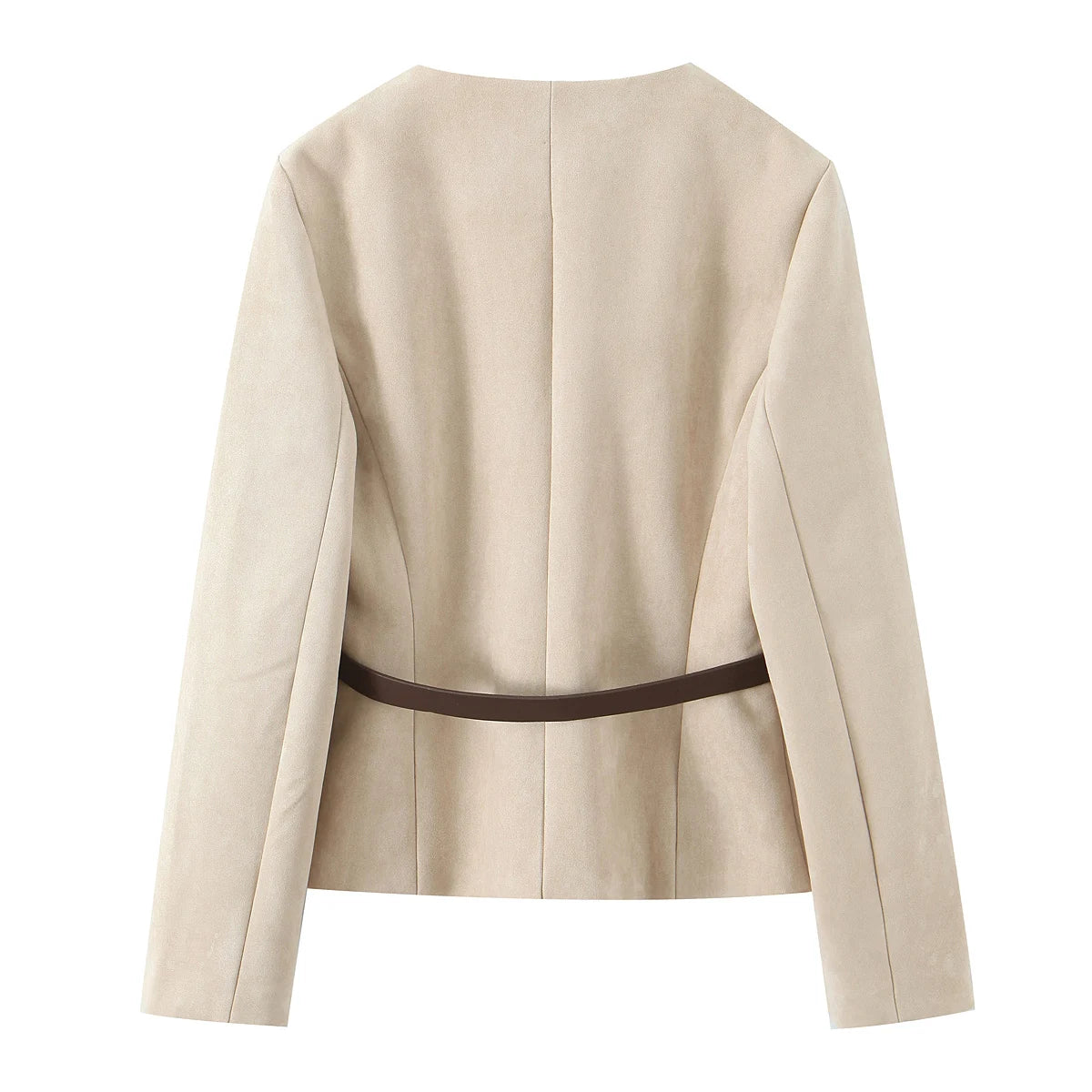 Beige jakke i ruskind med brun bælte detalje, elegant design, langærmet, perfekt til forårsmode, stilfuld og moderne beklædning til kvinder.