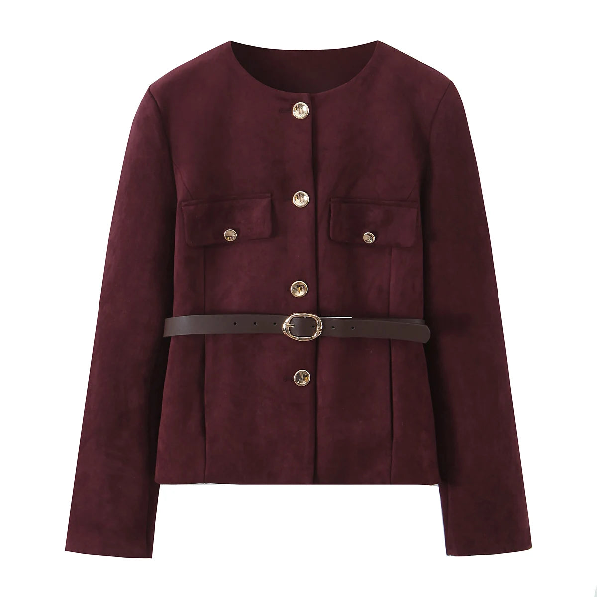 Bordeaux ruskindsjakke med guldknapper og bælte. Elegant design, perfekt til efterårsmode. Ideel til stilbevidste kvinder.