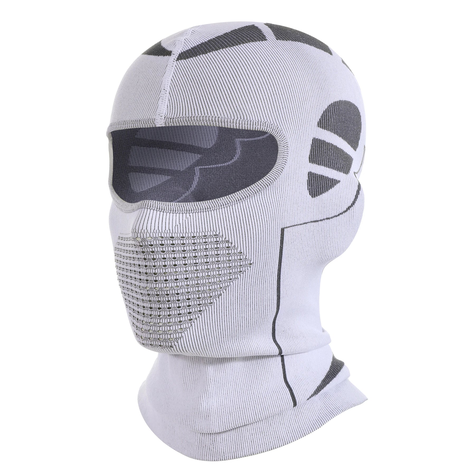 Hvid balaclava med futuristisk design, sorte grafiske detaljer og ansigtsmaske. Ideel til udendørs sport og vinteraktiviteter.
