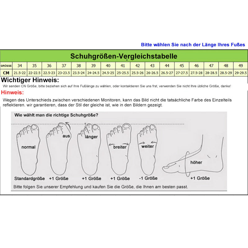 Skostørrelses sammenligningstabel med illustrationer af forskellige fodtyper: normal, bredere, længere, højere. Vælg korrekt skostørrelse.