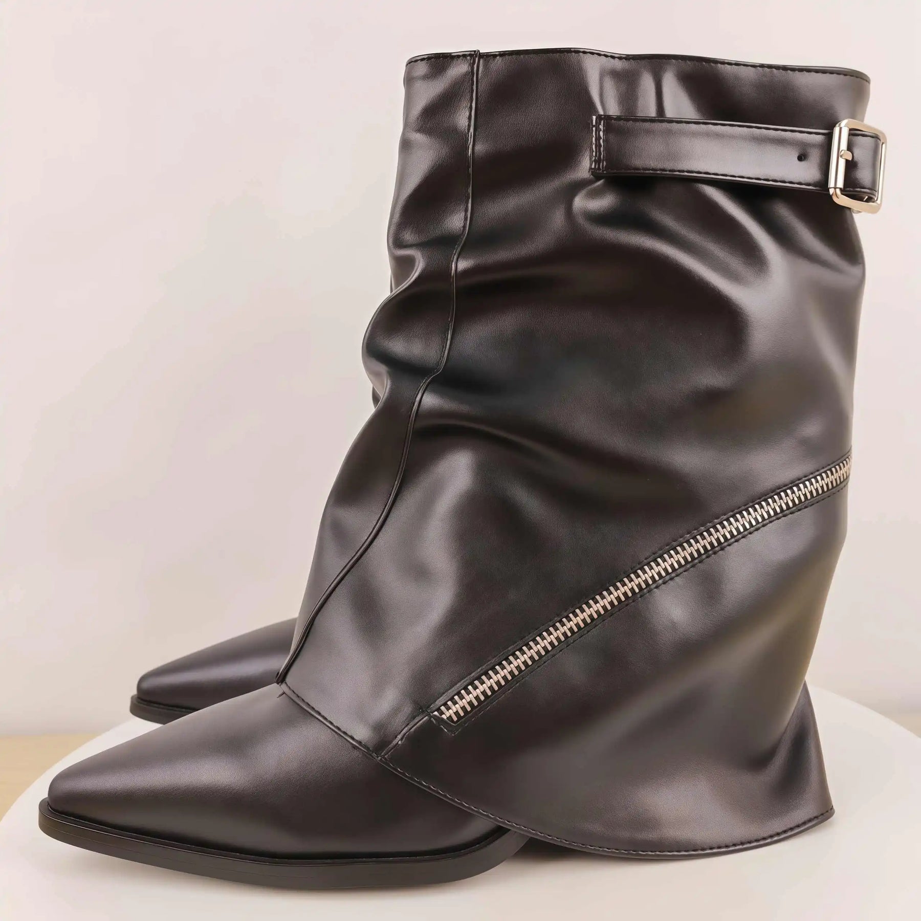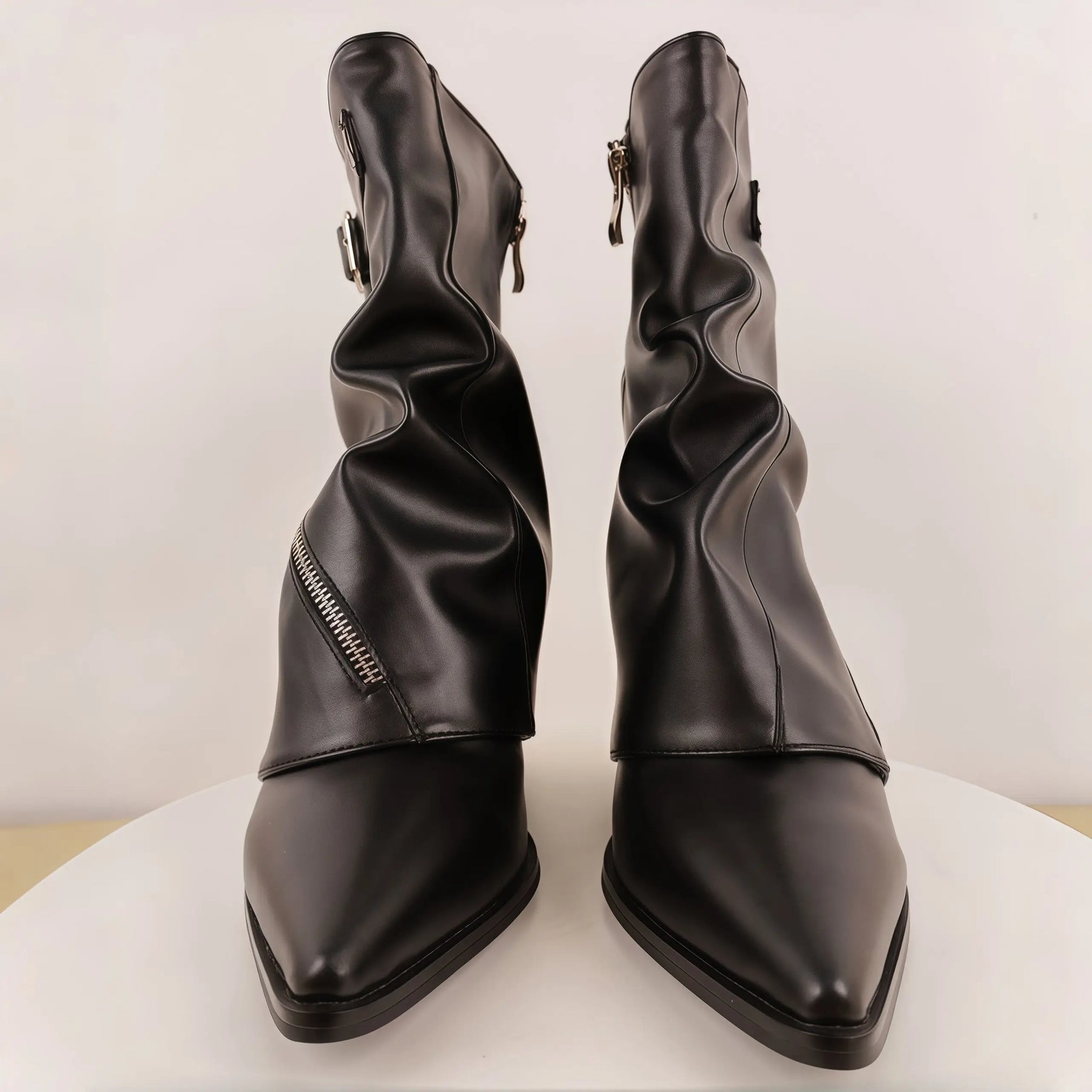 Sort læderstøvler med spids tå, lynlås og spænde. Moderne design, rynket look. Perfekt til modebevidste kvinder. Ideel til efterår og vinter.