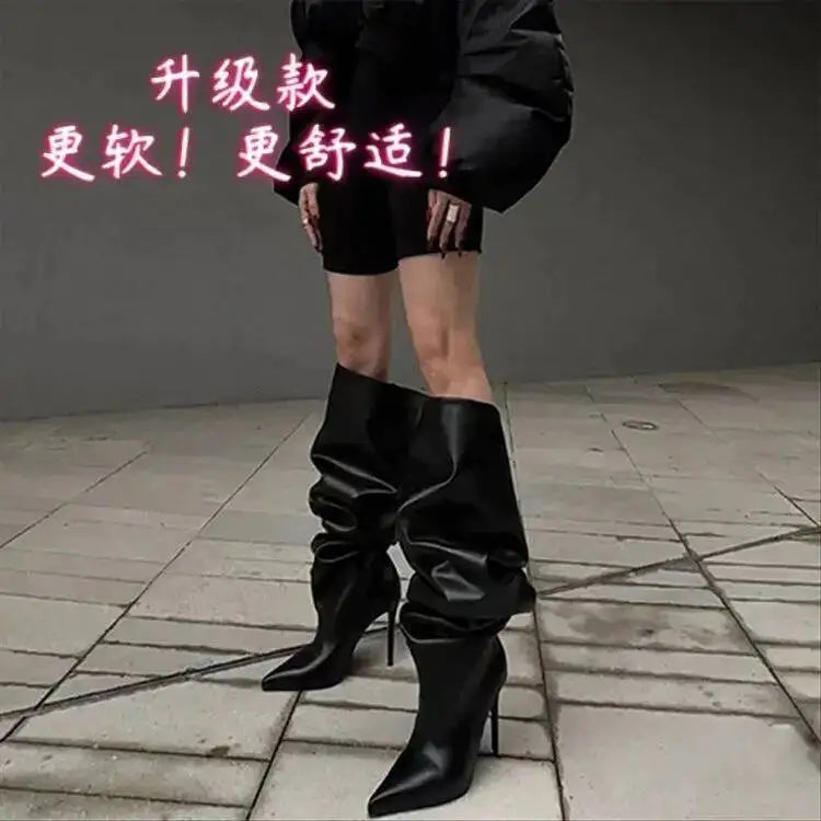 Ці чоботи до коліна для жінок поєднують високий, елегантний дизайн з практичним комфортом. Вони оснащені тонким каблуком (Stiletto Heel) та загостреним носком (Pointed Toe), що створює гострий і жіночний вигляд. Голенище чобіт має розслаблений (вільний/зморшкуватий) дизайн і підходить тим, хто потребує широкої ікри (Wide Calf).