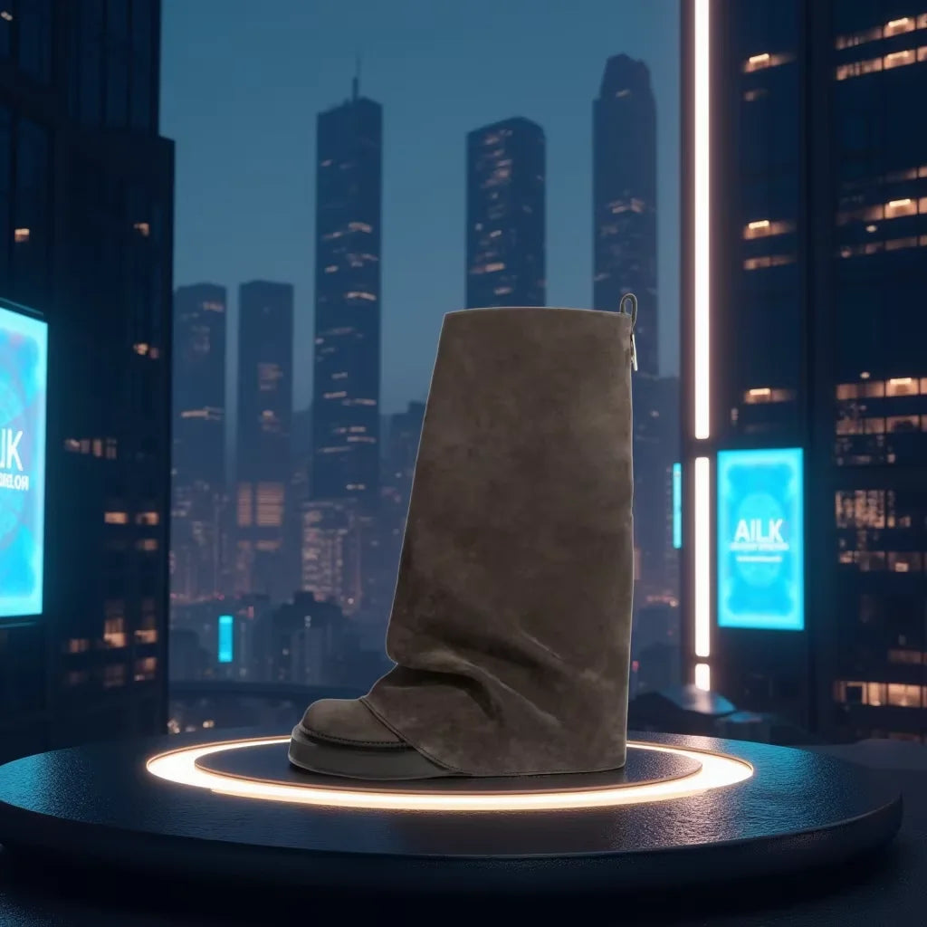 Brun støvle på futuristisk platform med byens skyline i baggrunden, aftenbelysning, moderne mode, urban stil, skyskrabere, nat.