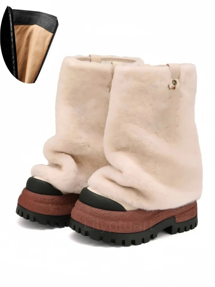 Beige pelsstøvler med tykke såler og lynlåsdetalje, vinterfodtøj til kvinder, stilfulde og varme, ideelle til kolde vejrforhold.