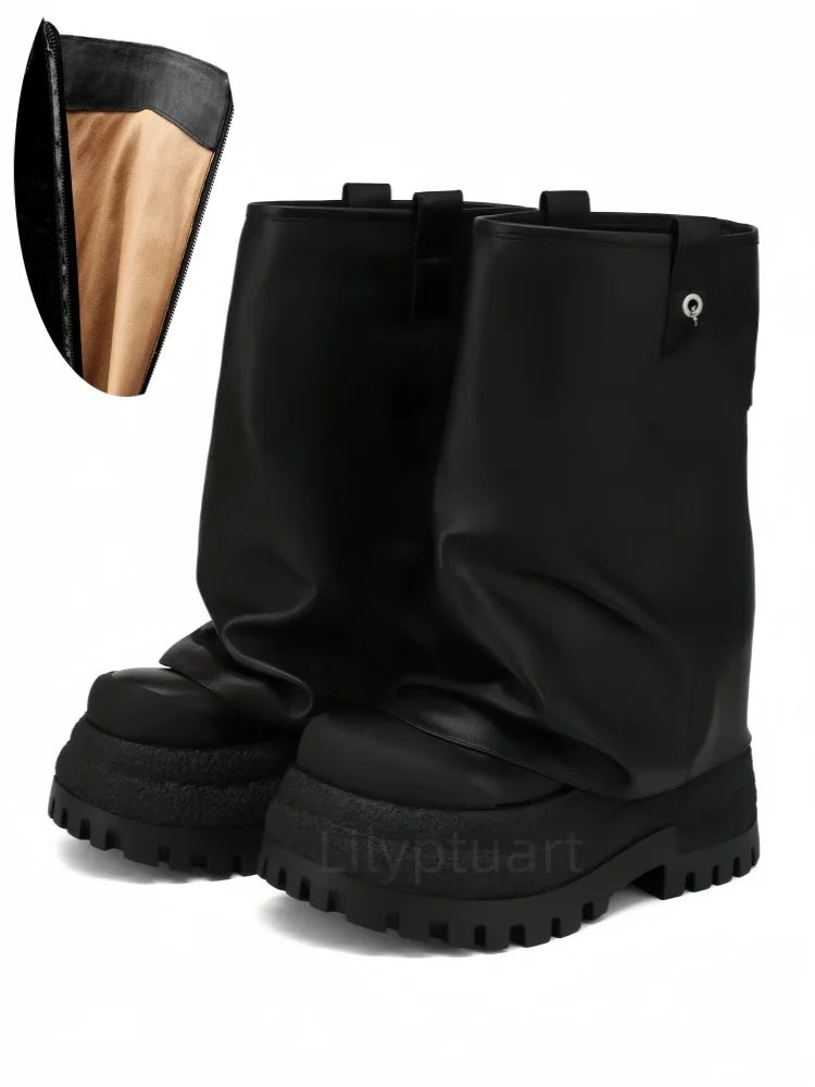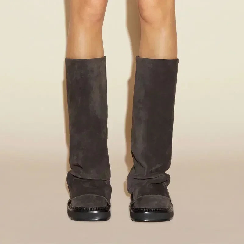 Dame Chunky шкіряні балетки та високі чоботи до коліна - квадратний носок, вільна посадка, зимове повсякденне взуття з плісированими брюками