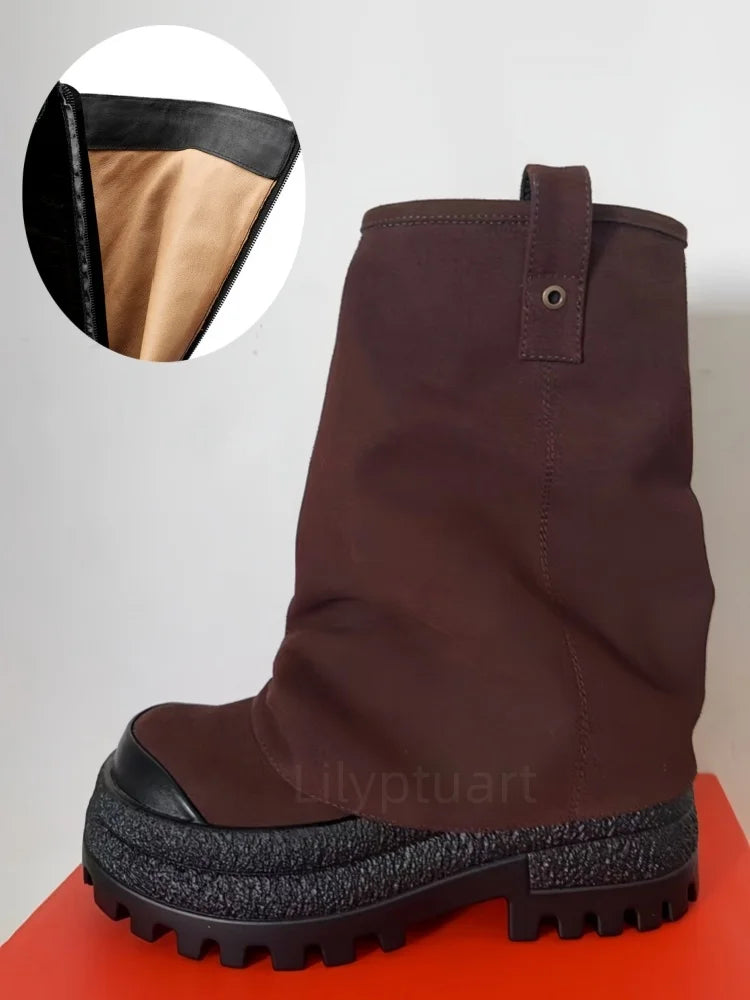 Brun ruskindsstøvle med unik, overdimensioneret design. Moderne fodtøj, stilfuld og trendy, perfekt til modebevidste.